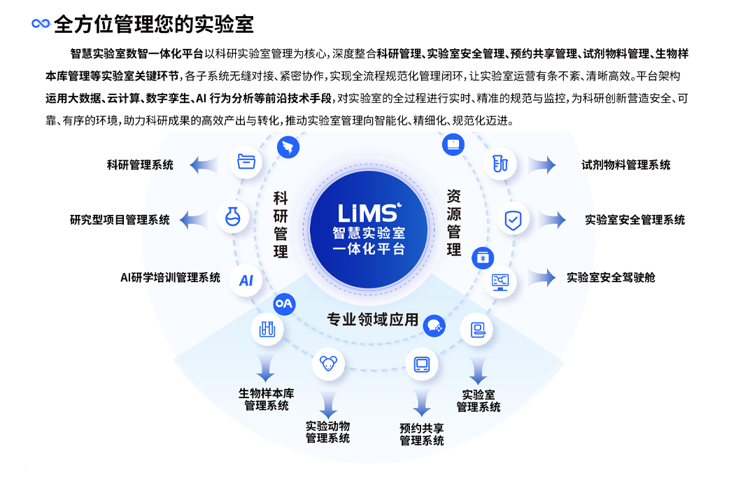 智慧实验室LIMS解决方案球盟会(中国)LIMS智慧实验室解决方案顺利获得引入先进技术和管理模式,解决了传统实验室管理中的诸多问题,提升了实验室的运营效率和安全性。该解决方案以“防、管、智”为一体的实验室管理理念,结合物联网、AI 智能、球盟会(中国)据分析等技术手段,打造了实验室智慧管理一体化应用平台,实现了从资源管理到科学研究全过程的优化,从而提升了实验室的整体效能和服务水平。
